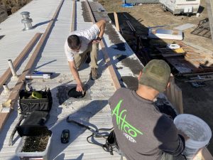 When we arrived the mobile home had been gutted and on its way to new plywood on the floors, new drywall, and the plumbing and electrical were being worked on. This project was much like our house in SC because every time they turned around another issue came about. For example, we had just finished doing the drywall in the kitchen and after a storm, two leaks in the kitchen ceiling arose, so this led to conversation about the roof. Before long, Tim and Josh had a plan for installing a new roof on the entire house. During our time there we were able to help with drywall, electrical, insulation, roofing, exterior skirting, cabinet installation, front door installation, new OSB flooring, and more.